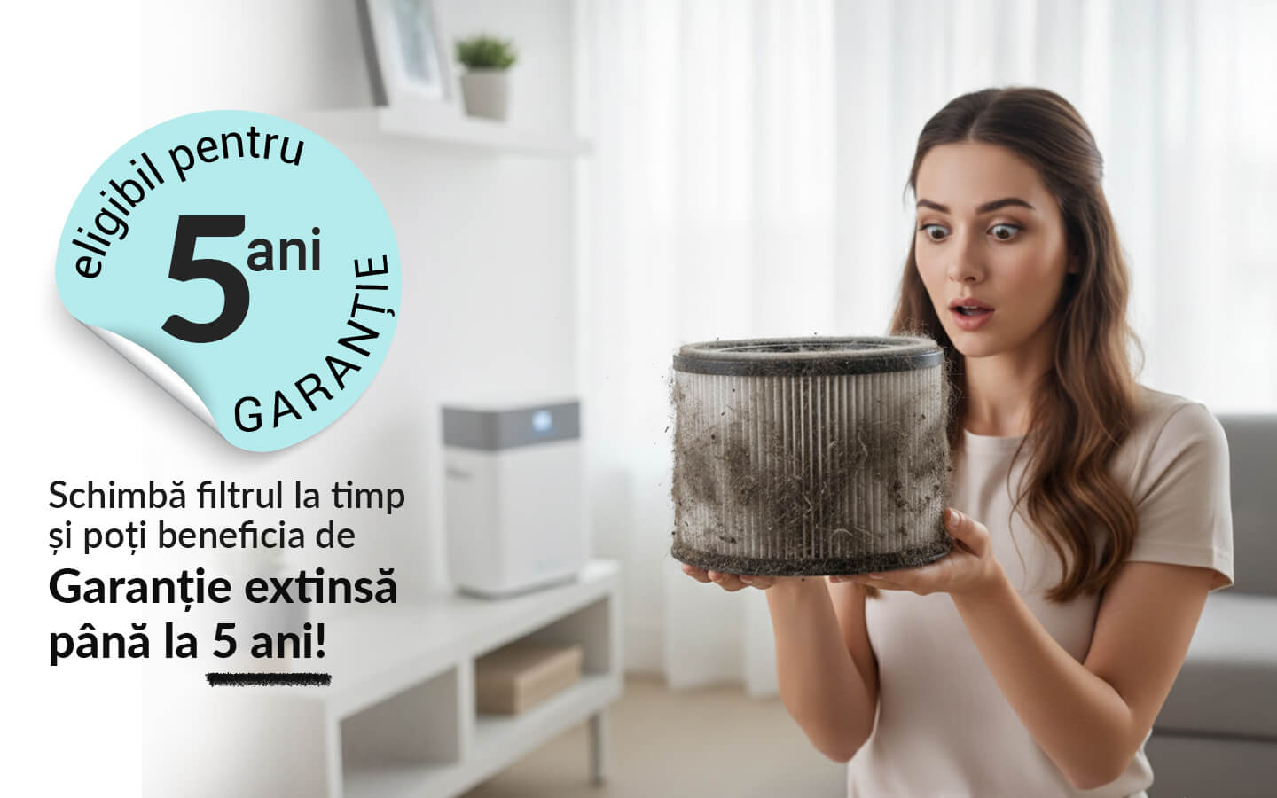 Filtrul HEPA furnizat este sigilat intr-un ambalaj de plastic. Desigilarea acestuia pentru utilizare duce la imposibilitatea returnarii filtrului, din motive de sanatate, filtrul putand fi contaminat cu agenti prezenti in aerul ventilat inca de la prima utilizare. In conditiile returnarii unui produs cu filtru desigilat din ambalajul de plastic, ne rezervam dreptul de a retine valoarea filtrului inclus in pachetul livrat.