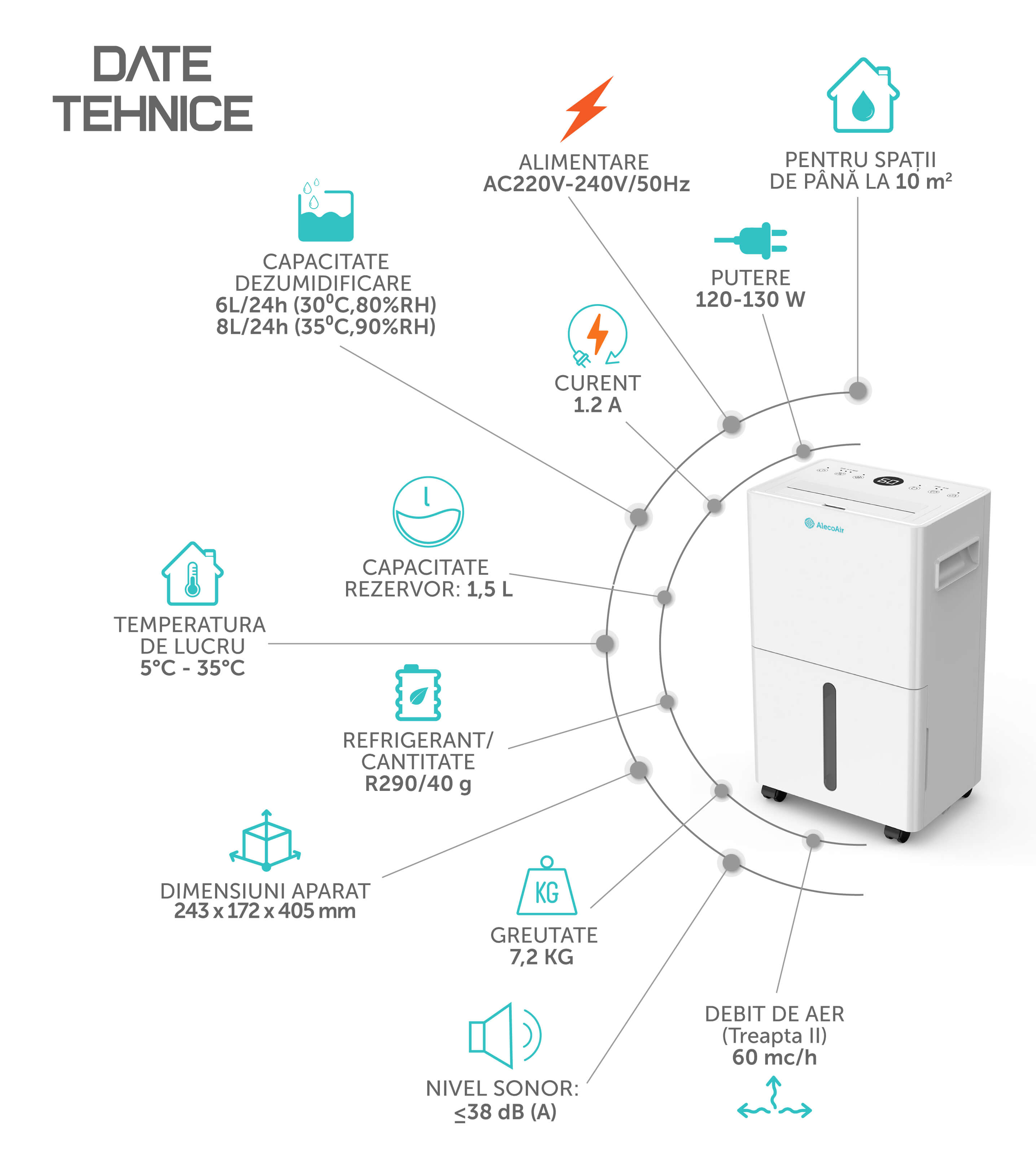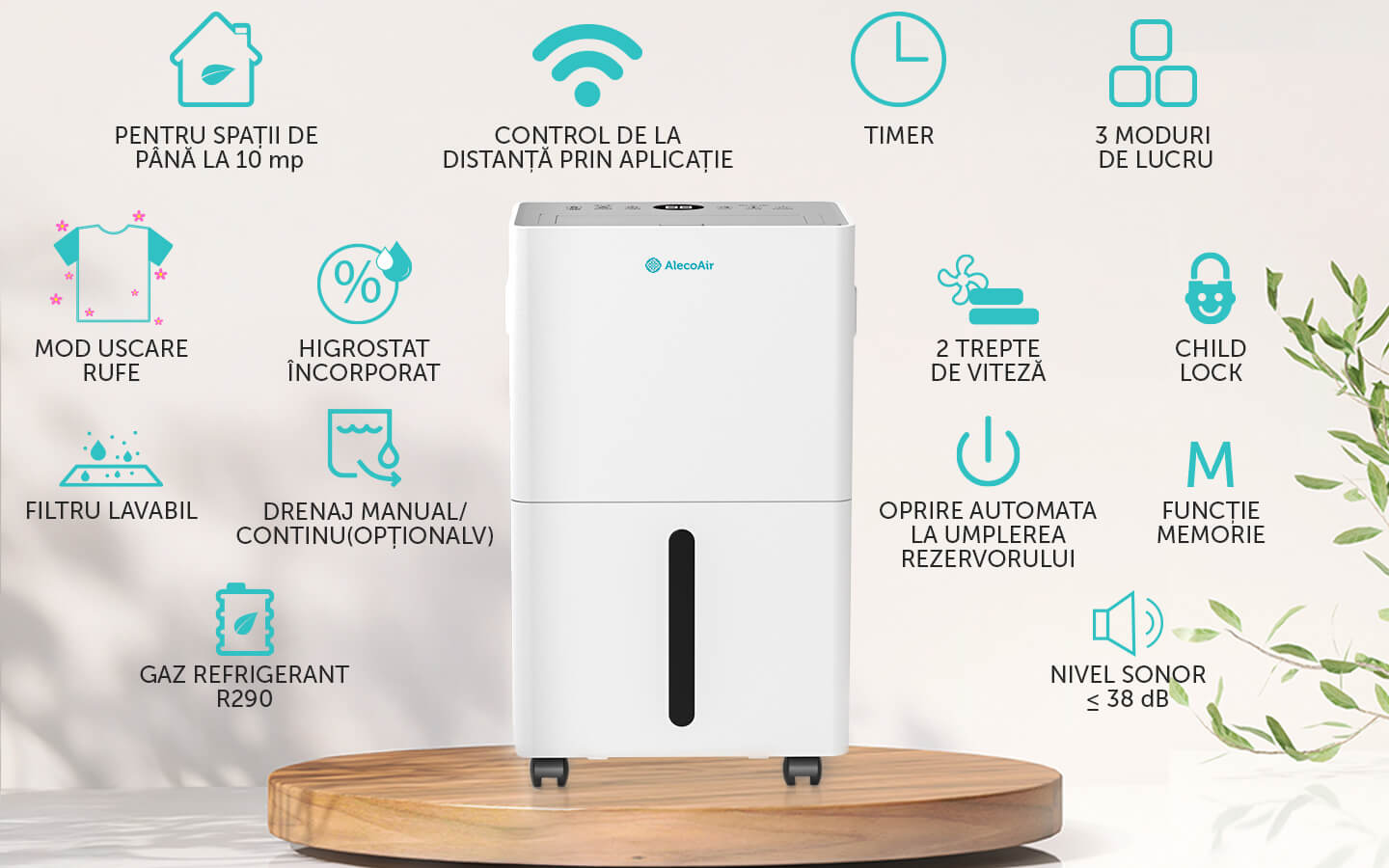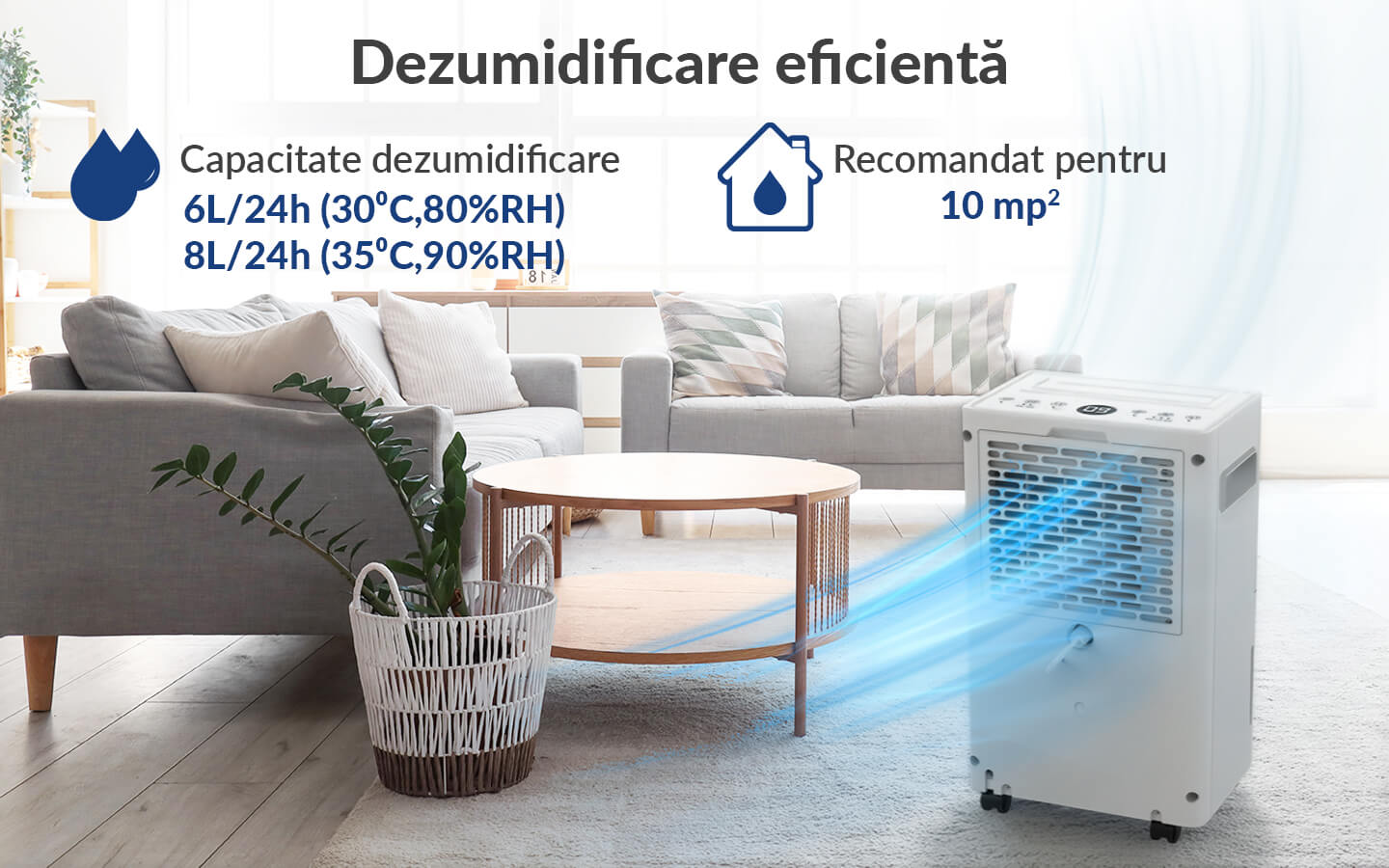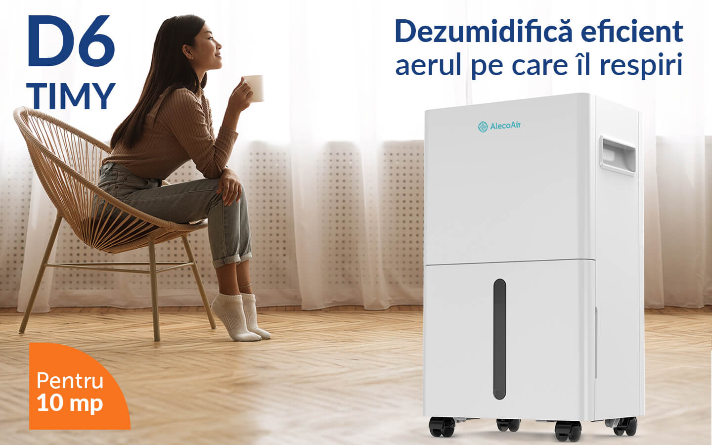 - Mod Dezumidificare: ajustezi umiditatea tinta si viteza ventilatorului in functie de necesitati, iar D6 Timy se opreste automat cand se atinge umiditatea setata