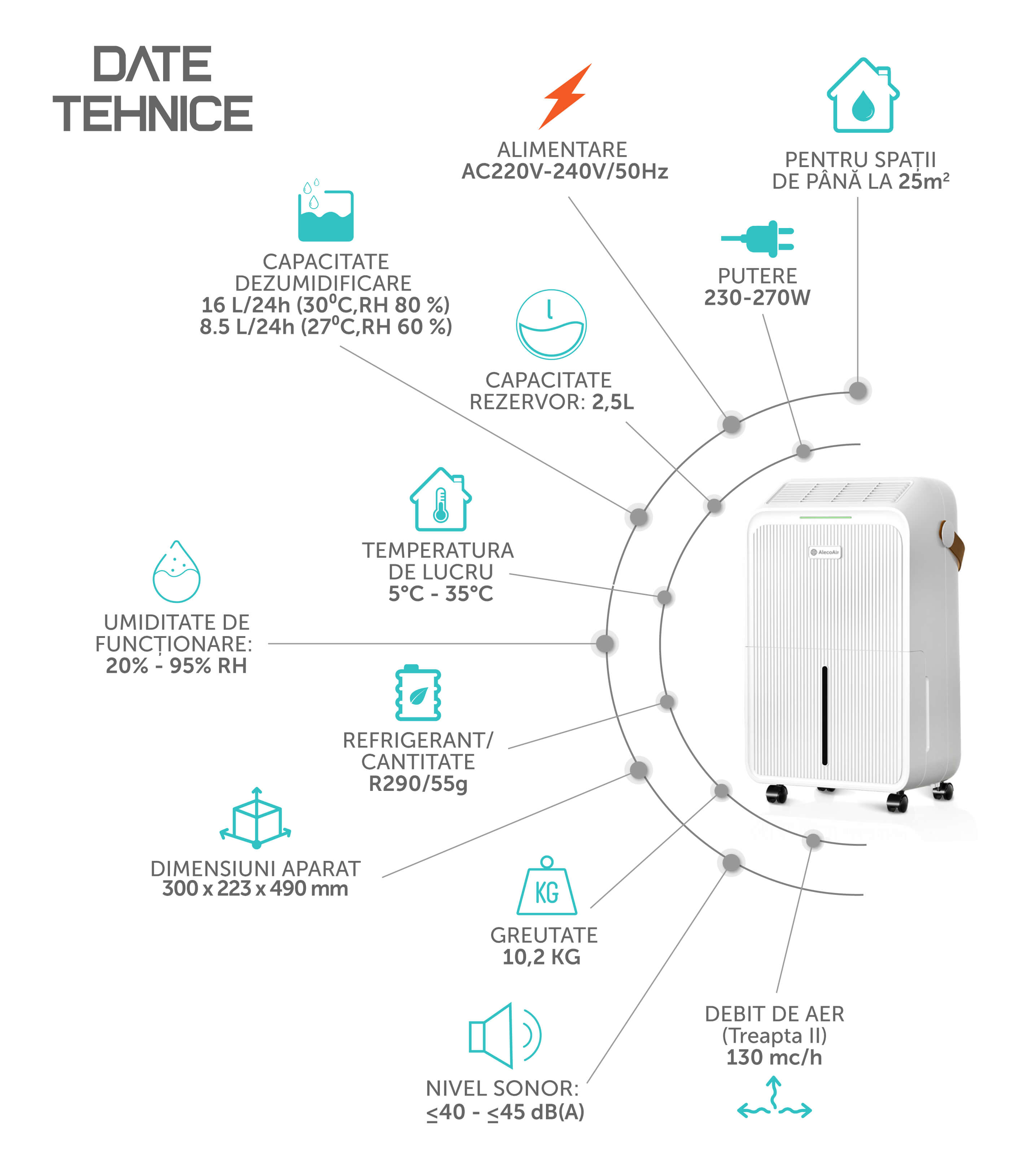 - Capacitate de dezumidificare: 16 L/24 h (30°C, RH 80%), 8.5 L/24 h (27°C, RH 60%)
