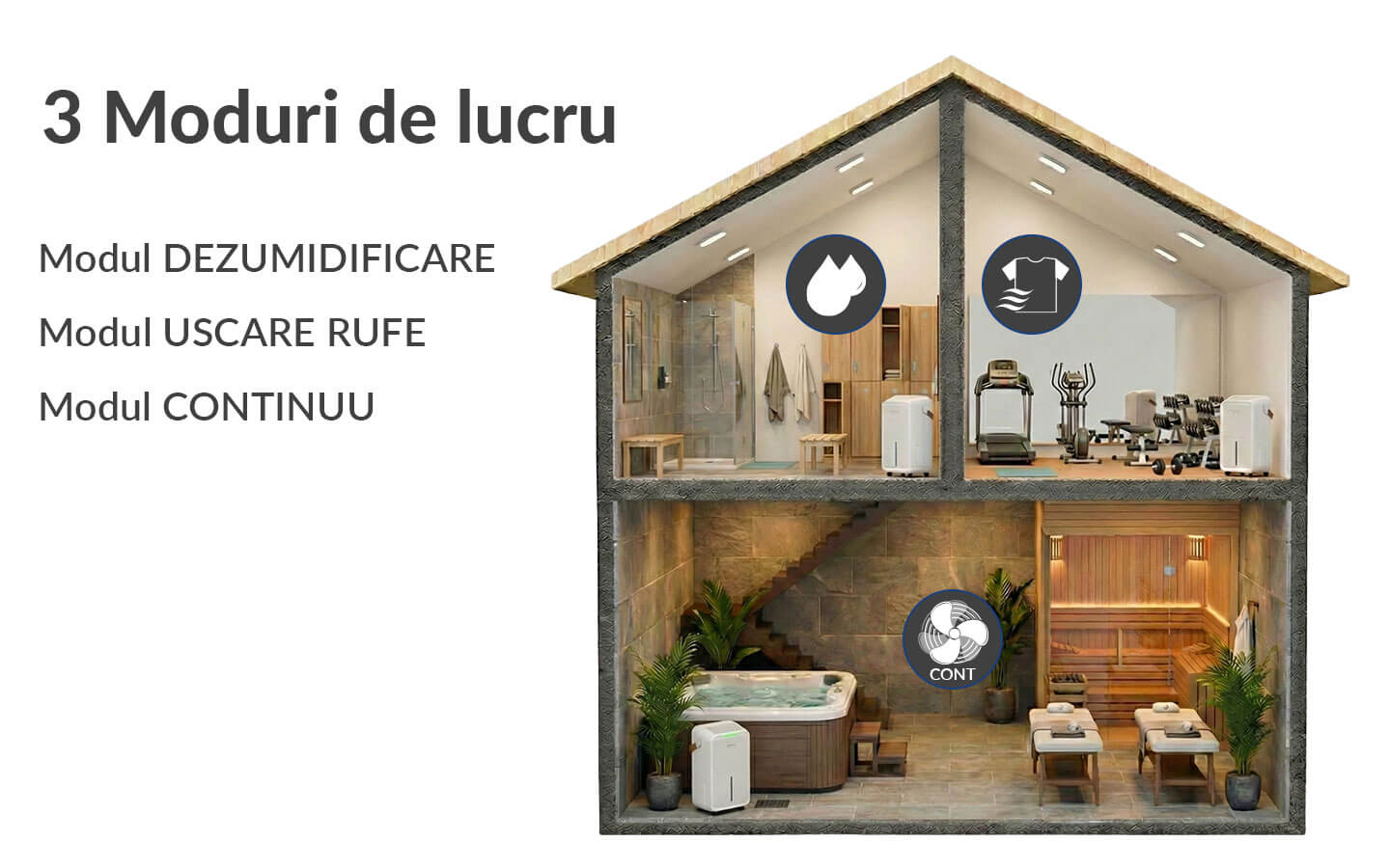 - 3 moduri de lucru: Auto, Continuu si Uscare rufe