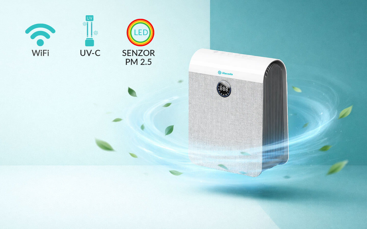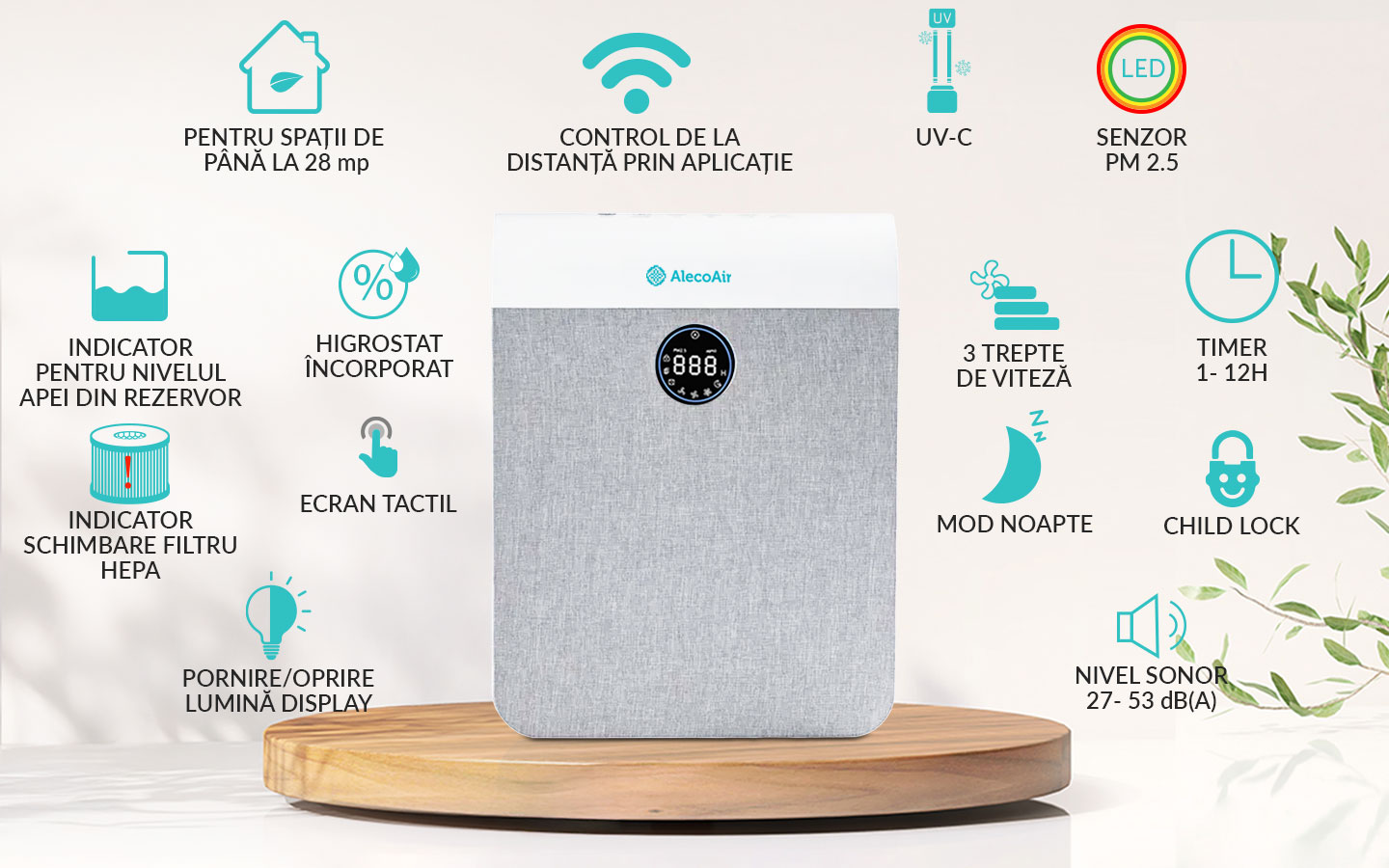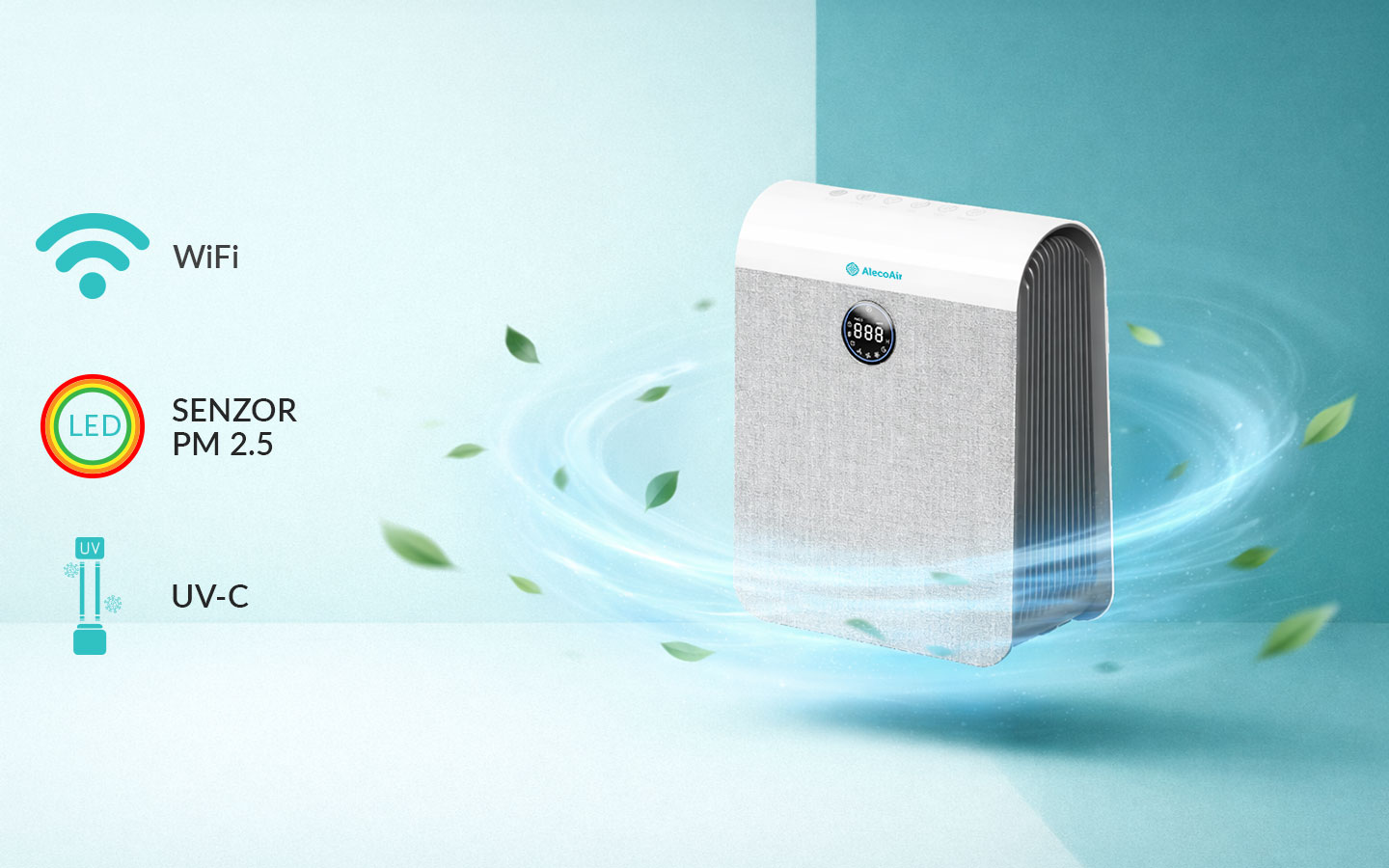 - Wi-Fi: Aplicatia AlecoAir pentru smartphone permite controlul aparatului de la distanta prin intermediul functiei Wi-Fi (doar retele Wi-Fi de 2.4 GHz). Practic, ai control complet asupra calitatii aerului din casa, chiar si atunci cand nu esti acolo.