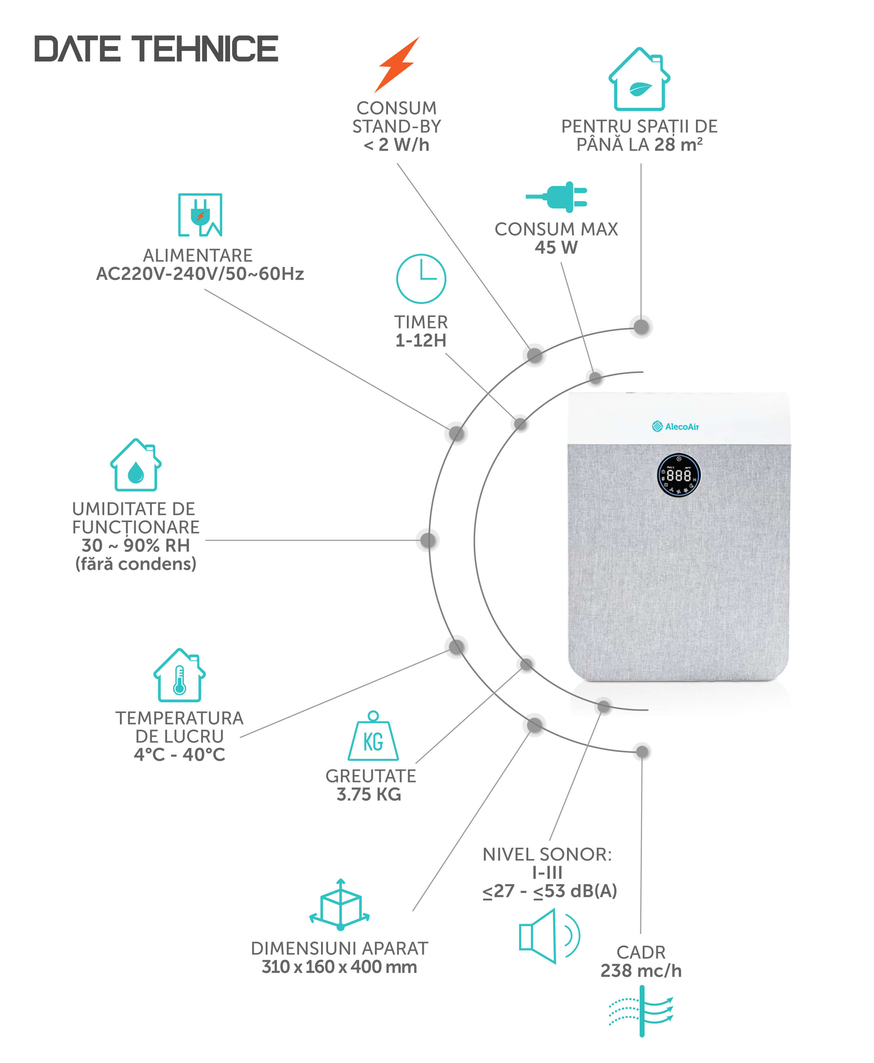 - Recomandat pentru incaperi de pana la: 28 mp (H = 2,6 m)