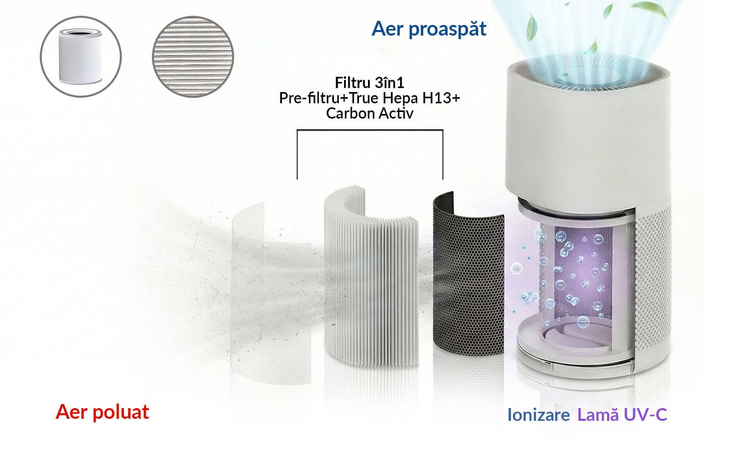 | Tip Filtru | Filtru HEPA; Carbon Activ; Pre-filtru |