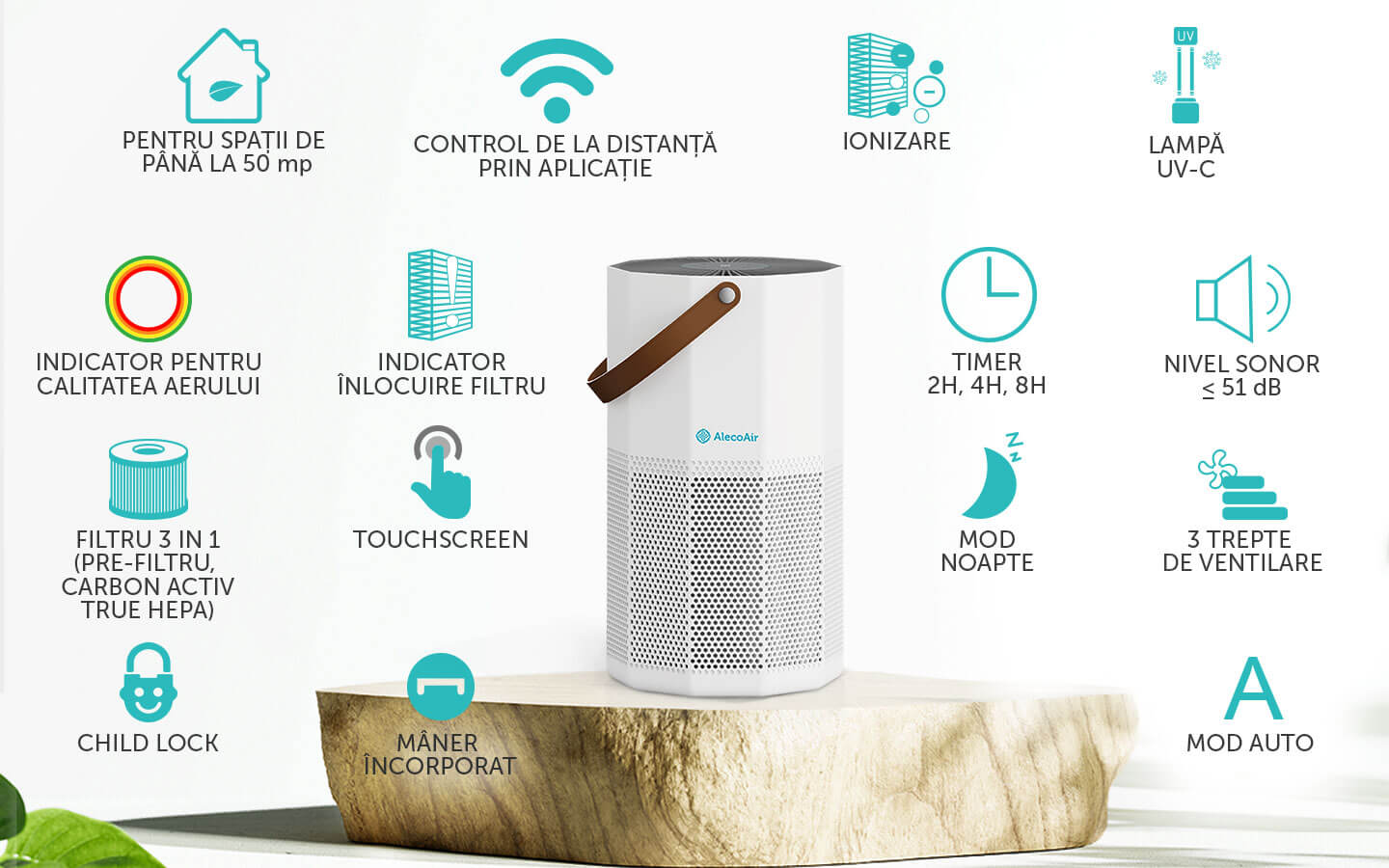 Functii | Sleep; Child Lock; Timer; WiFi; Mod Auto; Indicator filtru murdar |