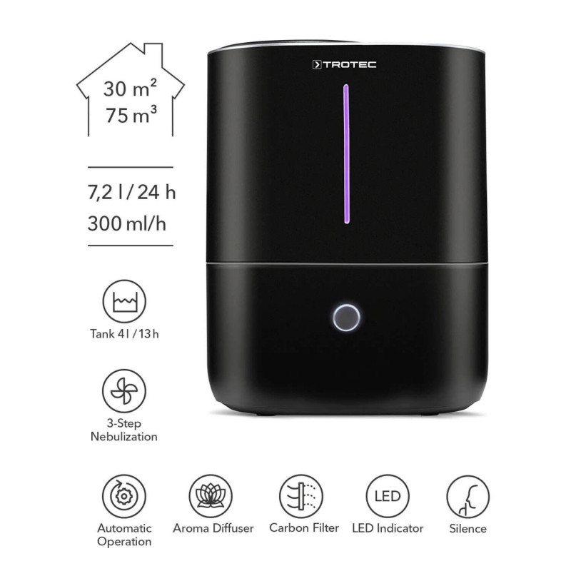 Umidificatorul cu ultrasunete TROTEC B2E detine un design placut si compact. Potrivit pentru suprafete de pana la 30 mp, B2E are o rata de umidificare de 300 ml/h pentru o crestere rapida a umiditatii si o capacitate de umidificare de pana la 7,2l / 24h.