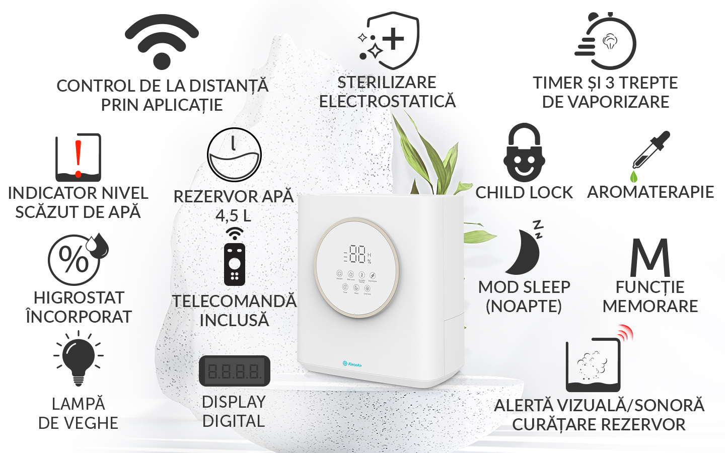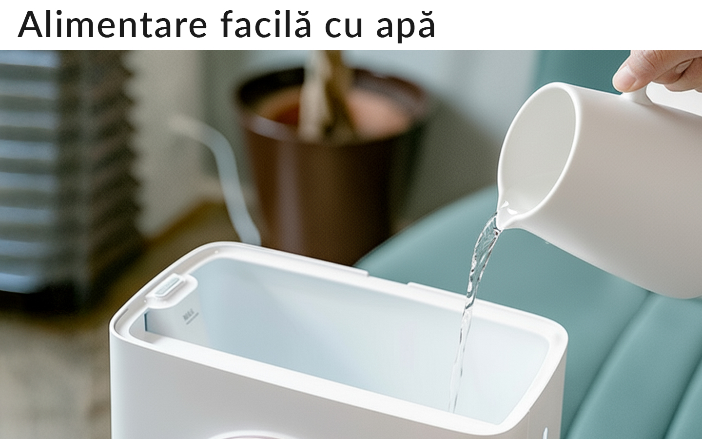 Cu o capacitate mare de umidificare de pana la 315 ml/h si un rezervor generos de 4.5 L, aparatul asigura o functionare indelungata cu reumpleri mai rare, fiind perfect pentru utilizarea zilnica.